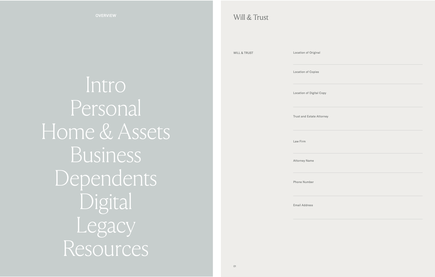A physical folio, thoughtfully crafted and elevated design. Tabbed, with document pockets and removable pages, that walks you through everything the people you love would need if something happened to you.